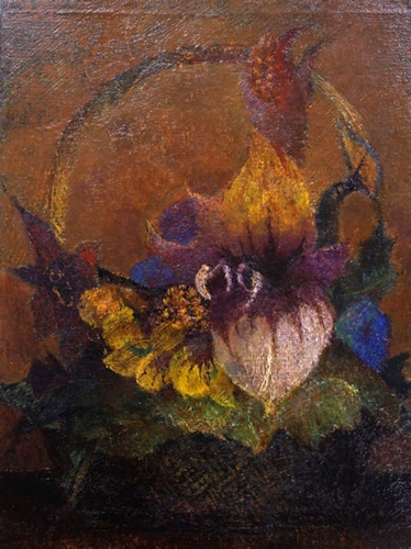 画面右端の花は構成上の効果を生んでいるに止まらず、主題の人物との親近性から人物の特質をも示唆しているとすれば、むしろ実在する花ではなく心象的に創作されたものであると考える方がより適切です。クレマチスの細いけれども強靭なツルと大きな花に、すみれの謙虚で健気なイメージを重ね合わせていたのでしょうか。ナルシスは、自分の無邪気な振舞いがもととはいえ、自ら望んだわけでなく不本意にも自己以外を愛せない境遇に追い込まれました。その点、岩田自身もある意味似た境遇にあることを暗示したかったのでしょうか。