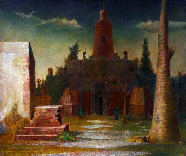 《風景(C)》はそのうちの1点です。廃墟のような建造物と画面右端のデフォルメされた樹木で構成されています。奥側の建物は塔屋を備えた造りのようですが、周囲には樹木が生い茂り、暗く沈んで細部は判然としません。手前側には弱い光が当たっていますが、附属建造物、囲壁や門柱らしきものはあるいは欠損しあるいは崩れています。空には不穏な雲、全体に空虚で不安な雰囲気が漂っています。