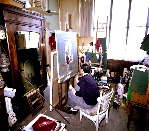 1980年前後に活躍した画家のアトリエを訪ねた興味深い写真集があります。南川三治郎『アトリエの画家たち』(朝日新聞社 1983年3月刊)です。これを見ると、アトリエ村「モンマルトル・オ・ザルティスト」の同じ広さの部屋ながら、荻須高徳(1901年~1986年)のアトリエ内部風景と岩田のそれとではおもむきがまったく異なります。他の画家たちのアトリエを見ても、年代の違いや描く対称の違い等々はあるものの、それぞれに個性的、そしてその雰囲気は何かしら作品に通じるものがあるように思われます。